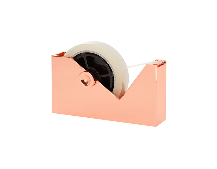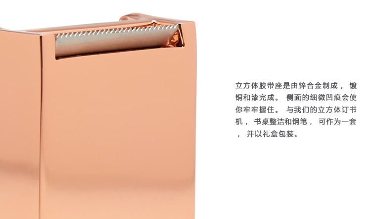 立方体胶带座是由锌合金制成,镀铜和漆完成。侧面的细微凹痕会使你牢牢握住。与我们的立方体订书机,书桌整洁和钢笔,可作为一套,并以礼盒包装。