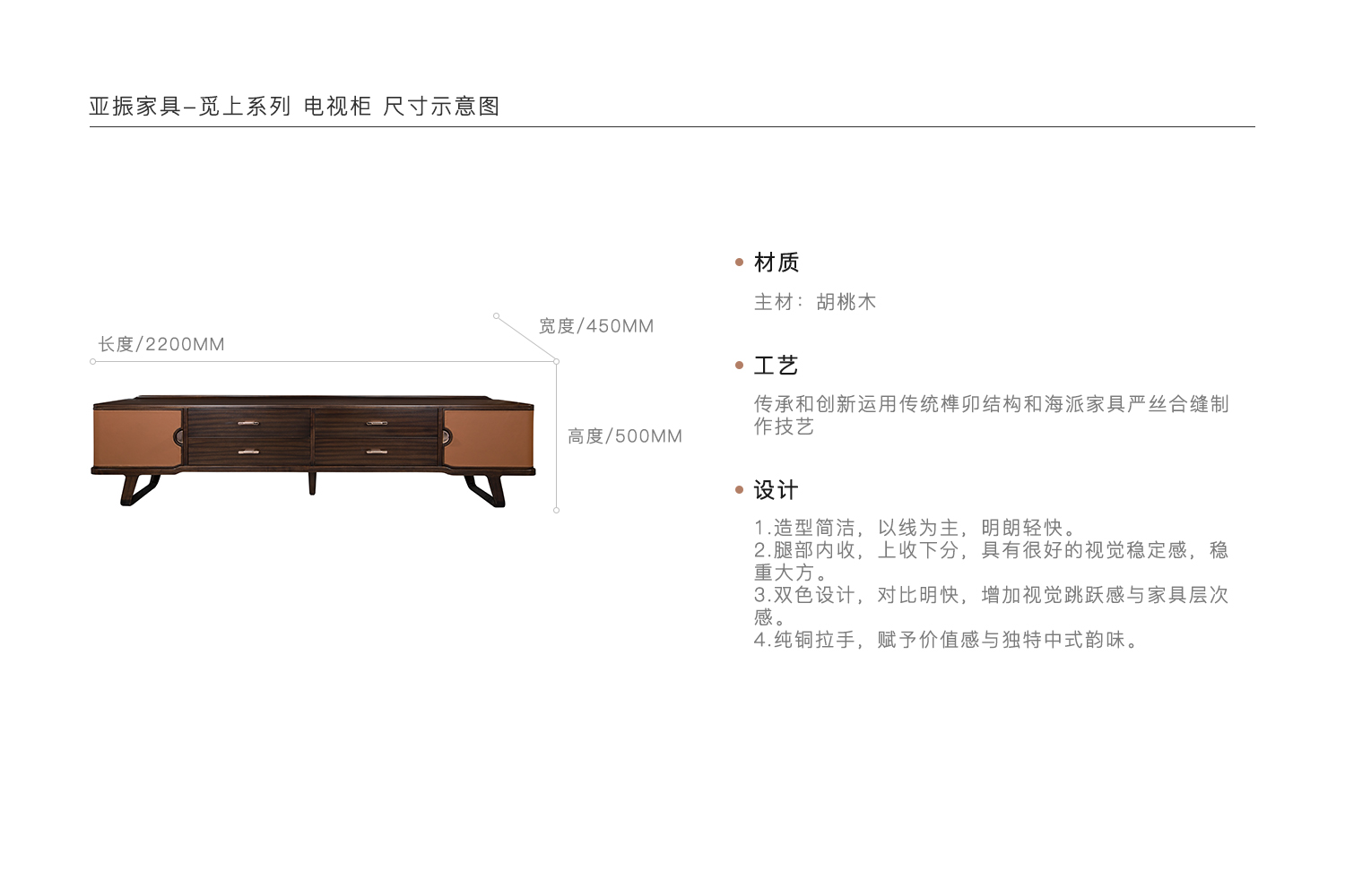 1.造型简洁,以线为主,明朗轻快。 2.腿部内收,上收下分,具有很好的视觉稳定感,稳重大方。 3.双色设计,对比明快,增加视觉跳跃感与家具层次感。 4.纯铜拉手,赋予价值感与独特中式韵味。