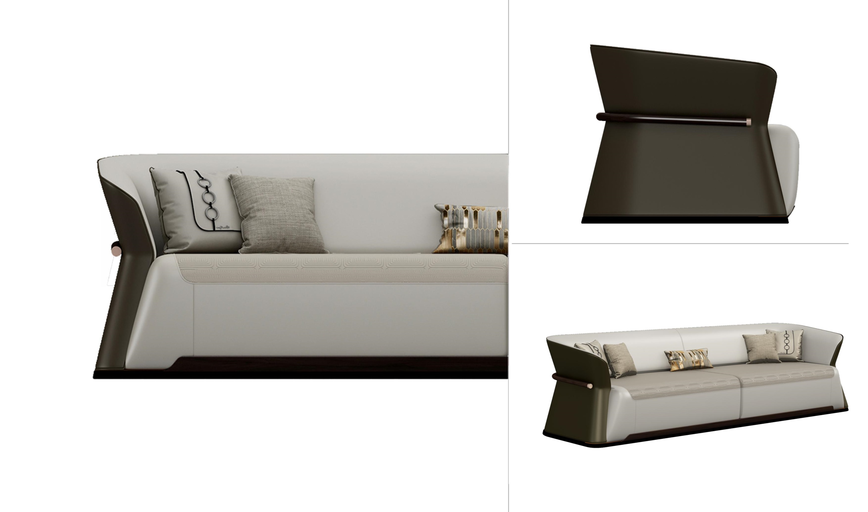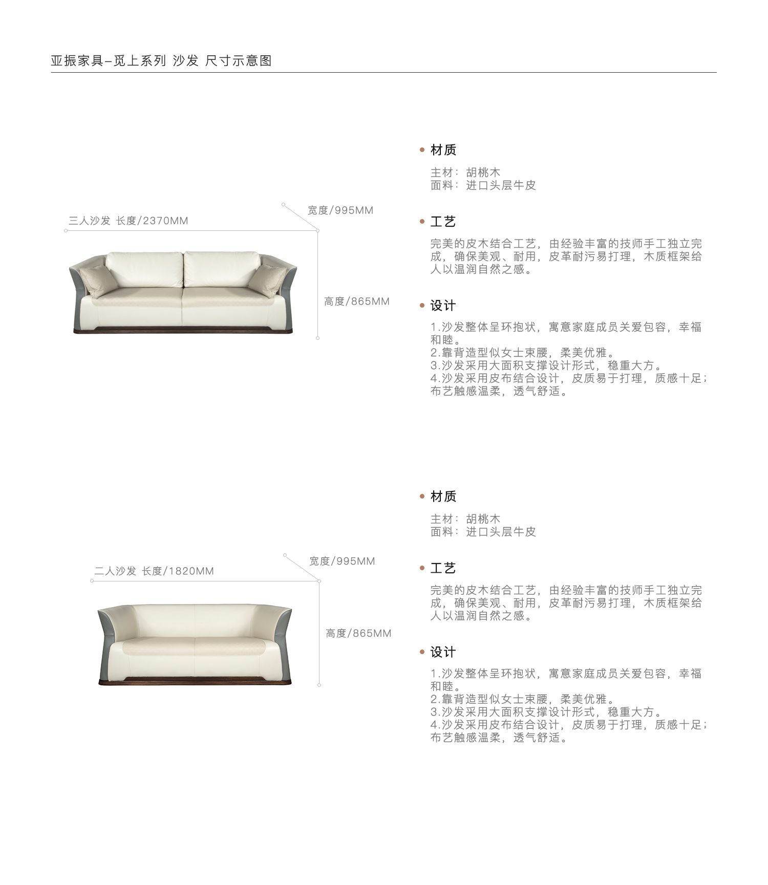1.沙发整体呈环抱状,寓意家庭成员关爱包容,幸福和睦。 2.靠背造型似女士束腰,柔美优雅。 3.沙发采用大面积支撑设计形式,稳重大方。 4.沙发采用皮布结合设计,皮质易于打理,质感十足; 布艺触感温柔,透气舒适。