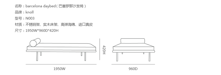 "一代大师密斯•凡•德罗(Ludwig Mies van der Rohe)在1929年设计了这张经典的巴塞罗那躺椅(床)。它将皮革、原木和金属完美地结合在一起,是对很多以往出现过的床的一个彻底简化,回到最简单的设计,因此,它不但是一件家具,还是设计大师对现代建筑理念的一个缩影。高级实木框架,可供黑色、枫木色和胡桃色。表面哑光漆处理全真皮制作。高密度弹性海棉制作,回弹性好,配有头枕。6厘米宽皮带编织支撑,高级不锈钢脚,需拆装。