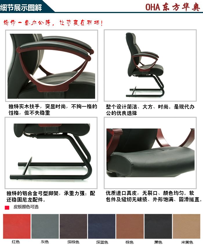 1.椅面/椅背:选用进口牛皮,(或环保皮),经过多层处理,符合BIFMA1级规格.皮面光泽度好,透气强,柔    软且富有韧性,厚度适中,具有冬暖夏凉的效果且手感良好