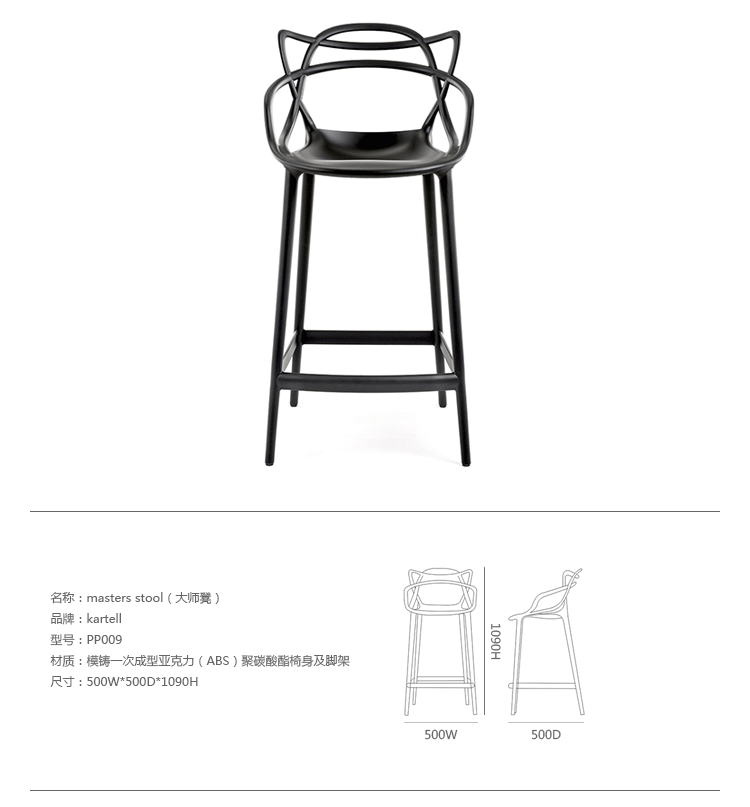 Masters Stool(大师凳)是大名鼎鼎具有鬼才之称法国籍天才设计师Philippe Patrick Starck的家具设计作品,Good Design Award 2010 和 Gold Dot Award 2013的获奖作品,至今,仍为业内人称赞和追逐,是一把收藏价值较高的经典椅。其给人感觉是由3根藤缠起来,4根细长的腿,看起来椅子很宽敞,很舒适,较其他椅子,它很独特;当然,它还非常坚固,你不需要担心它是否能承受一个人的重量。