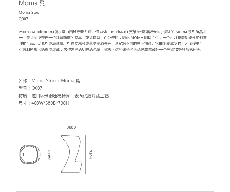Moma Stool(Moma 凳)是由西班牙著名设计师Javier Mariscal(贾维尔·马里斯卡尔)设计的Moma系列作品之一。设计师决定做一个别具新意的家具:花盆造型、户外使用,因此MOMA因运而生,一个可以塑造功能性和创意性的产品。此凳子可纳凉观景、可独坐思考或享受美酒等等,满足您不同的生活情调。它由旋转成型的工艺流程生产,生态材料聚乙烯树脂组成,各种各样的明亮的色调,试想下这些组合将会给您带来如何一个原始和新鲜触觉体验。