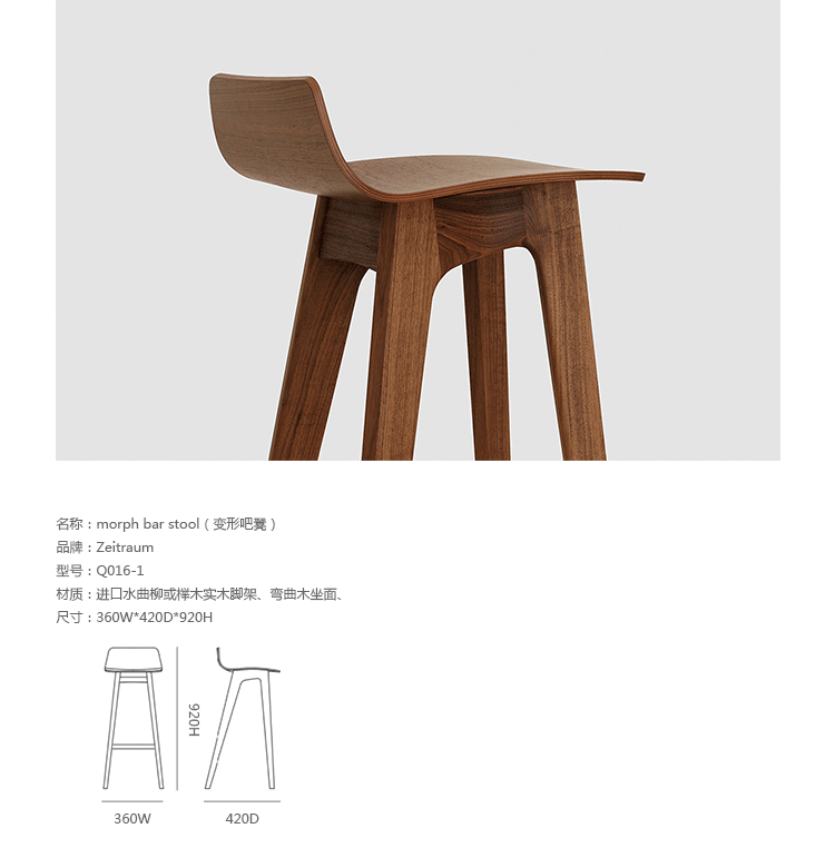 德国家具厂牌 ZEITRAUM 讲究的不仅仅是家具,它着重的是一种"生活态度",每件 ZEITRAUM 家具除了需具备实用、耐用、容易搭配的基本要件,更重要的是可以衬托用户与空间的个性,简约取代夸张花俏的线调,细腻精巧的做工低调传递设计师缜密的设计思维。ZEITRAUM 使用来自永续森林的落叶型硬木,表面以有机油/蜡涂装,完全不使用化学物质,让用户与家具在空间自由呼吸。Morph bar stool(变形吧凳)由丹麦设计工作室Formstelle设计,弯曲的弧线漂亮的惊讶,本以为这随性的木设计又来自丹麦,想不到却是来自严谨的德国。丹麦设计的影响力可见一般。如果放在现代的环境中还是复古的空间里,都是非常漂亮的家具。坐感非常的贴合人体工学,其木材的拉丝设计脱颖而出。