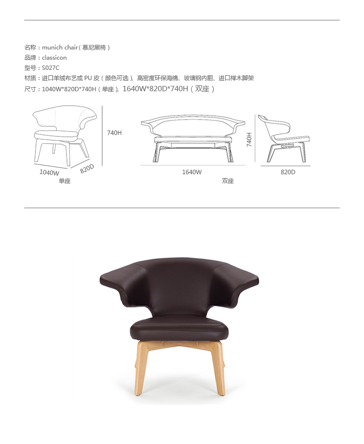 "Munich Chair (慕尼黑椅)是设计师Matthias Sauerbruch和Louisa Hutton共同设计的。实木框架,鲜明的涂漆或黑染色,钢管与框架橡胶织带。座垫填充聚氨酯与涤纶纤维,表层覆盖织物或皮革包裹。20 世纪和 21 世纪的现代艺术值得拥有这样的恰当的家具布置,同时也是现代化的家具与建筑。柏林建筑师Sauerbruch Hutton因此面临着令人兴奋的挑战,当他被要求设计德国慕尼黑的布兰德霍斯特博物馆(Brandhorst Museum)。2009年开馆时,他为为食堂、 门厅、 会议和讲座室,以及休息室制定了三种不同的座位解决方案。ClassiCon 开发的系列生产与建筑师密切协作。同时要求在形式和质量方面的期望上,家具在公共空间中将会面临典型磨损和撕裂也不得不加以考虑。设计通过各种测试,确保了其耐久性。"