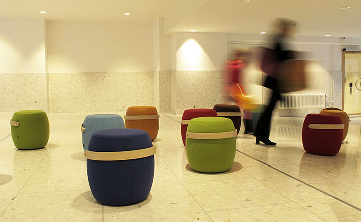 来自斯堪的纳维亚studio vision A&D的设计师和建筑师mattias stenberg设计了“carry-on”便携式小家具。这个设计的灵感来自于传统木桶的形式,设计师在桶表面包裹了一层毛绒布软垫,并搭配一个实木把手。“carry-on”有多种功能,它可用作小凳,脚凳或是摆放物品的台座。这个设计在2012年斯德哥尔摩家具/灯具展览会(stockholm furniture and light fair)上展出。同时,这个设计的展位也“greenhouse”展场的一部分,专门用来展示年轻设计师的作品。
