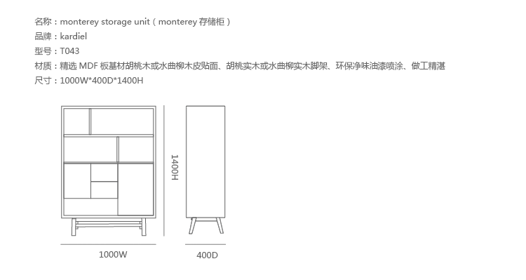 monterey storage unit(monterey存储柜)是Kardiel公司制作的经典实木家具,具有世纪中期的现代风格。在现代主义的存储家具上, Finn Juhl和 Arne Vodder 最先尝试胶木和天然木的组合运用。这是大胆的创新,他们结合传统的新鲜的新兴技术与现代主义的概念。制作采用精选MDF板基材胡桃木或水曲柳木皮贴面、胡桃实木或水曲柳实木脚架、环保油漆喷涂、做工精湛,是您理想的选择。
