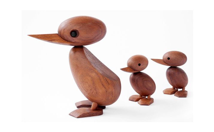 Wooden Duck And Duckling(木鸭与小鸭子)的制作灵感来源于真实的故事,故事回到了1959年丹麦哥本哈根的春天场景。正当人们与自然万物自由的伸展苏醒时,某天,在Frederiksberg街头出现了春天出游的鸭妈妈正带领着一群呱呱叫的可爱小鸭过马路的画面,随后,出现了一位警察为牠们指挥交通并顺利的过了马路,隔天报纸就刊登出这幅景像并引起广大的回响。这看似不可思议的美好事件却反应出丹麦人珍惜呵护自然的天性,在与之共处的过程中总是细微观察并不断的上演着触动人心的情景。在那重视手工艺的黄金50年代,全球正掀起了一股「斯堪地那维亚现代主义设计」风潮,丹麦设计大师Hans Bølling为推手之一,他因为鸭子事件的报导而深受感动,因此设计了手工木鸭,作品中不但展现出简洁有机的线条并揉合了精湛的手工艺技法,且将主题延伸至人文社会环境的关怀,以独特的事件观点触动人心,而这正是「斯堪地那维亚现代主义设计」所要反应出的设计观点。这款1959年份出品的手工木鸭,虽经历了半个世纪之久后再度问市,却依然深得人心。当二十一世纪的人们开始了解到美好的生活似乎越来越像个神话,而地球上的物种灭绝的速度比科技发明来得快且无解时,出现了回归自然与环保的声浪,人们因此更懂得珍惜自然以及传统手工艺的经典设计,一种无法被工业化所取代的价值感与慰藉。