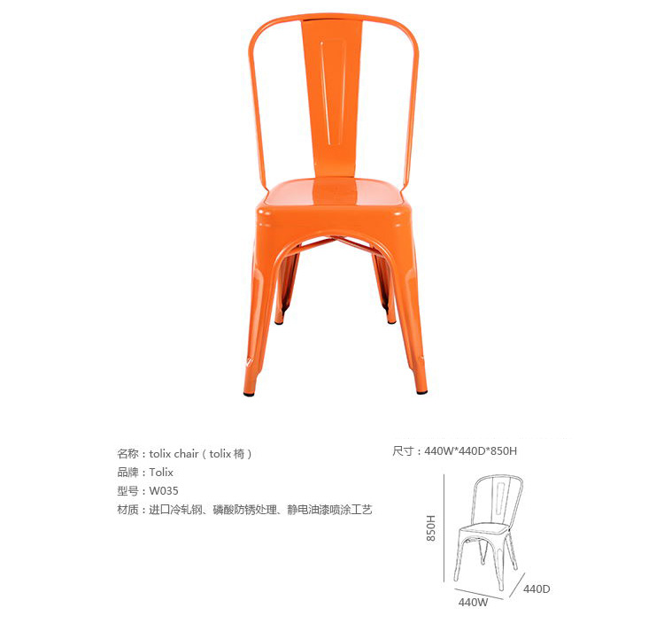 tolix chair(tolix椅)一把有味道、有态度的椅子,据说它最开始被使用在一艘战舰的天气预报房间里,故事的真实性与否不得而知,但是不影响其成为享誉世界的著名设计家具,1934年由Xavier Pauchard设计,早期是作为户外用家具设计,力图展现法式慵懒而闲适的气质,经年而来被全世界时尚设计师所宠爱,从室外扩展到家居、商业、展示等多个用途,而此椅也不负众望在各类空间中均有上佳表现,特别是近年来与混搭、乡村、美式、怀旧、北欧简约、中式等主要装修风格搭配,都呈现出独特的韵味,也被时尚界赞为“百搭第一”椅,可以用在酒吧,餐馆,咖啡馆等等地方,之后通过改进,设计出有扶手版本的tolix armchair(tolix扶手椅),高背版本的tolix high back bar stool(tolix高背吧凳),宽背版本的tolix wide back bar stool(tolix宽背吧凳),及tolix bar stool(tolix吧凳)和tolix mini stool(tolix迷你凳)。制作采用进口冷轧钢、磷酸防锈处理、静电油漆喷涂工艺、坐面为木板或PU海绵坐垫,颜色可选。