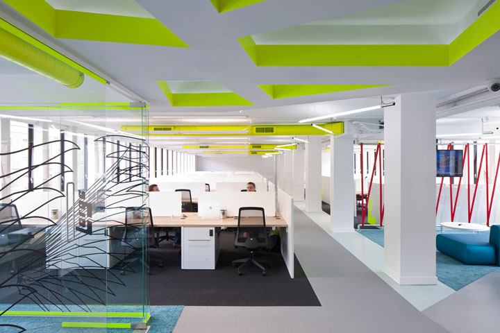 设计以白色为空间主调,加入充满活力的颜色,如霓虹黄色顶面线槽、以及柔软的绿松石色地毯点缀在灰与黑色地毯间。