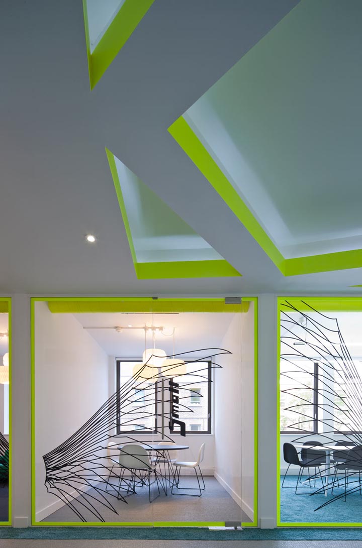 最有趣的设计当属会议室的玻璃隔墙,上面绘制了一系列的天使(Angel)翅膀图形,为密集的办公区增添了丰富的视觉效果。