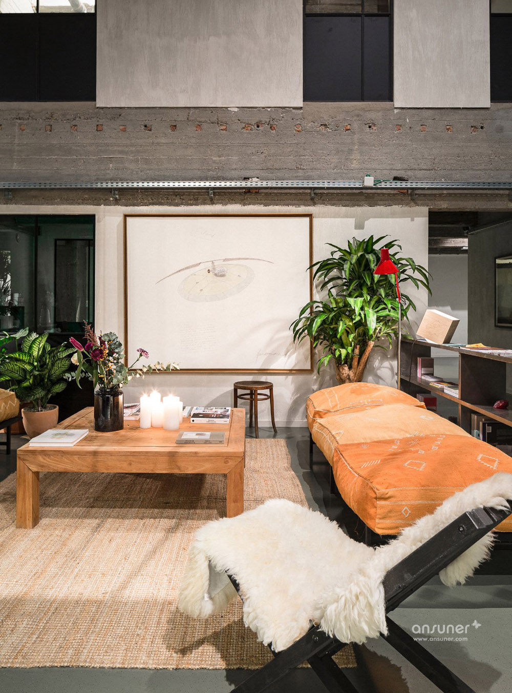 设计团队为这个空间定制设计了一些元素,比如由回收砖块和玻璃纤维制作的吧台。其它的如丹麦摩登傢俬、当代艺术作品和工艺品的完美混搭。漂亮的沙发来自比利时的家具品牌Journuit。