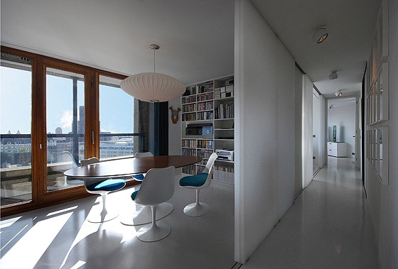 REFURBISHMENT OF A LISTED TOWER APARTMENT The flat is located above the city of London, only a short walk from the financial district amidst a on first sight, rough concrete oasis - the listed Barbican Centre. There is no traffic, instead ponds, gardens and a distinguished cultural centre on the ground level, including a concert hall, theatres, art galleries and cinemas. The 100 m² flat on the 17th floor of the Shakespeare Tower with spectacular view over the roofs of the city shall be the new residence of our client and also serve as an exhibition space. When the client purchased the flat it looked as if it was frozen in time with yellowed carpeting and the original kitchenette, albeit seemingly run down. Nevertheless the flat had a well arranged floor plan, although the corridor, kitchen and bathroom were located towards the inside of the building and therefore appeared dark and small. A Loggia stretches all around the flat. On the east side in front of the kitchen window it forms a terrace which offers unobstructed views over the skyline. From breakfast with the sunrise to an evening sunset it is only a few steps along the balcony. The flat shall become more flexible and spacious while maintaining the historic floor plan. Space for the display of contemporary art shall also be offered. The panoramic view must be visible from all corners of the flat. In order to achieve a greater lightness, the wall between the corridor and bedrooms was replaced by translucent sliding panels. Living rooms are completely coloured in white to underline their spaciousness and to form a minimalistic background for the art collection. In harsh contrast to this, the walls of the internal spaces of the corridor, bathroom and kitchen are coated with a smooth shimmering black cement finish. The dark finish allows small rooms to work larger and adds an elegance with the contrast to the white fixtures. The structure of the flat with its three layers becomes visible: the outside loggia, the white living rooms and the bathroom and kitchen completely wrapped in black. The solid wall between the bathroom and corridor was also removed and replaced by translucent sliding doors. When open, the owner can enjoy the panoramic view while soaking in the bathtub. If the balcony doors are also open, the gentle rumble of the metropolis can also be heard. The Barbican Estate was built between 1965 and 1976, on a site that was bombed in World War II.The complex was designed by the architects Chamberlin, Powell and Bon. The estate was officially opened in 1969 and is now home to around 4,000 people living in 2,014 flats. The flats reflect the widespread use in Britain in the 1960s and 1970s of concrete as the visible face of the building. "The intention underlying our design is to create a coherent residential precinct in which people can live both conveniently and with pleasure. Despite its high density the layout is spacious: the buildings and the space between them are composed in such a way as to create a clear sense of order without monotony. Uninterrupted by road traffic (which is kept separate from pedestrian circulation through and about the neighbourhood) a quiet precinct will be created in which people will be able to move about freely enjoying constantly changing perspectives or terraces, lawns, trees and flowers seen against the background or the new buildings or reflected in the ornamental lake." Chamberlin, Powell & Bon, Architects "Barbican Redevelopment" April 1959