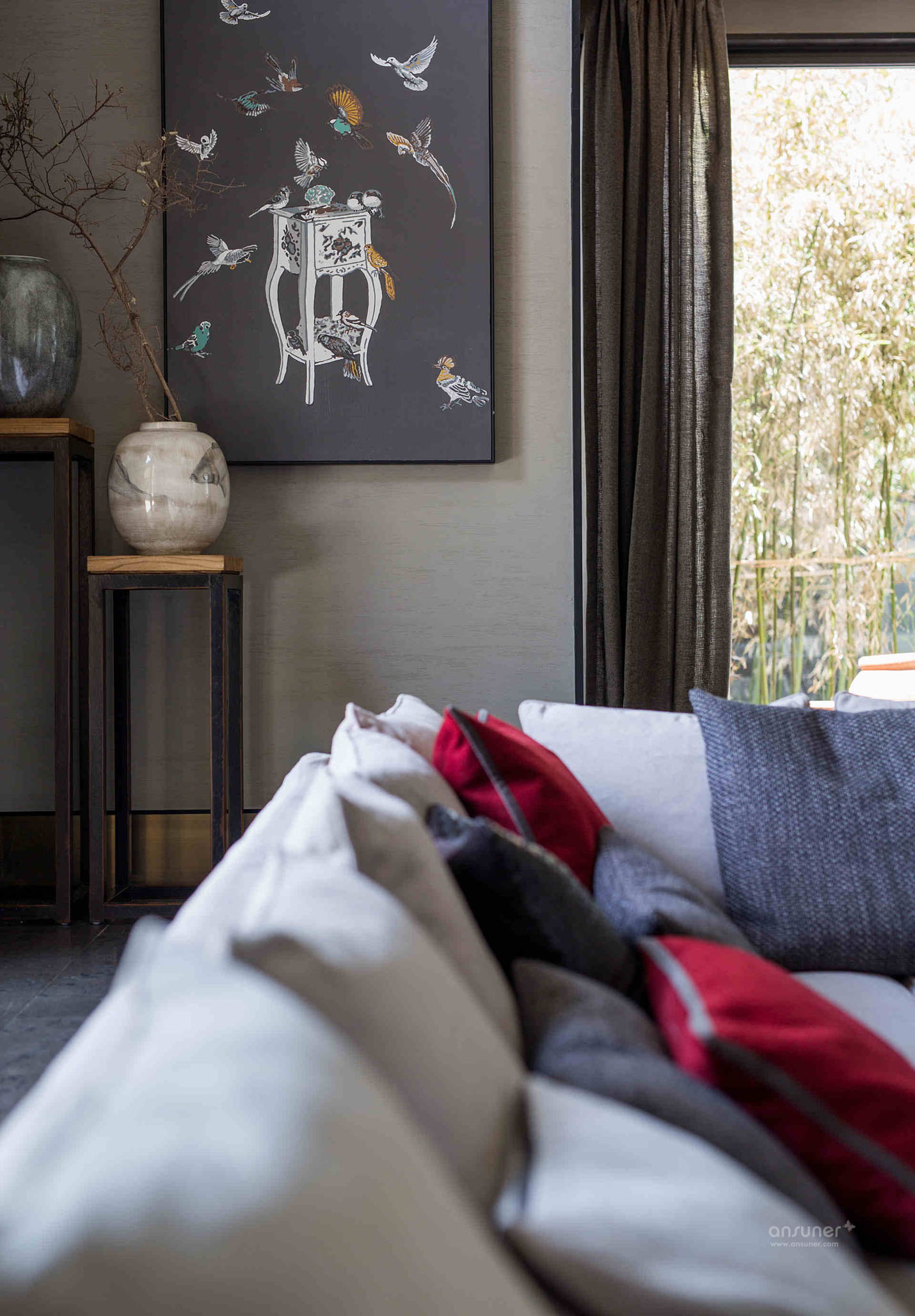 客厅:软装设计上,色彩浓重与用材粗放的矛盾组合,不拘一格,在隐藏的静室之下掺杂了强烈而又煽情的色彩视觉。细节处低调嵌入优雅的中国传统纹样,以打破重组的独特手法,在空间里造成恰当的碰撞,粗粝的花樽中,娇俏的花枝摇曳,明艳中还带有丝丝缕缕的纯真。