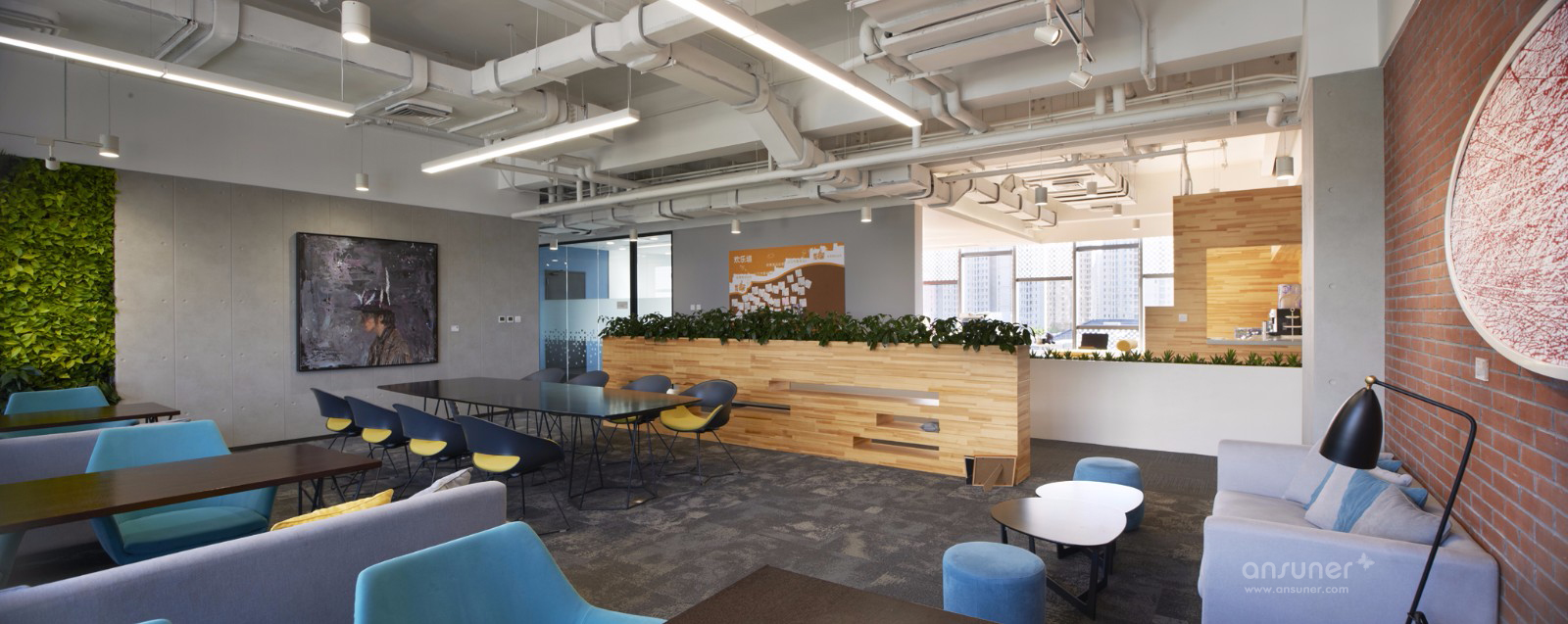 空间以灰白和木色为主色调,局部空间用鲜艳亮色加以点缀和活跃气氛。整体设计风格现代,稳重中又不失活力与激情,且处处体现着公司对员工的人文关怀。
