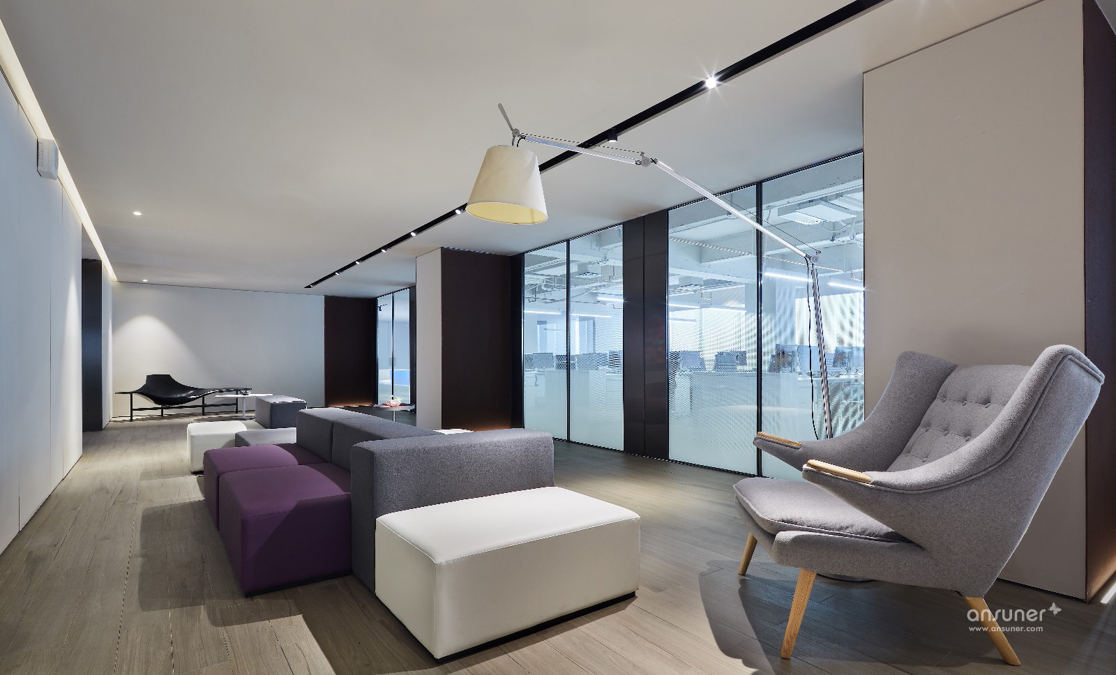 飞视设计之家这种办公组合形式给我们带来了一种开放式的空间体验:在这空间中,室内空间的划分十分灵活,通过家具的组织,形成不同的分区,传统的门厅、走廊、办公室布局已经不复存在,取而代之的,是一个完全开敞式的流动空间。水吧区提供着办公空间基本的管理和服务;大讨论桌除了提供休闲之外,还可以作为共享的会议区使用;休闲区则有着更多的开阔性,除了阅读、休闲还适合两三人的小组工作和讨论;如果你不想被来往的人们所干扰,则可以一头埋进工作站中专注手头的工作……总之,设计师将灵动开敞的空间使用方式代入到了该办公空间中:你可以在这里任意选择最需要的使用空间。