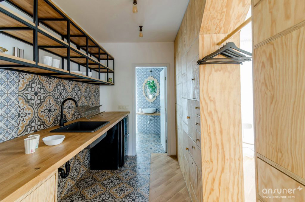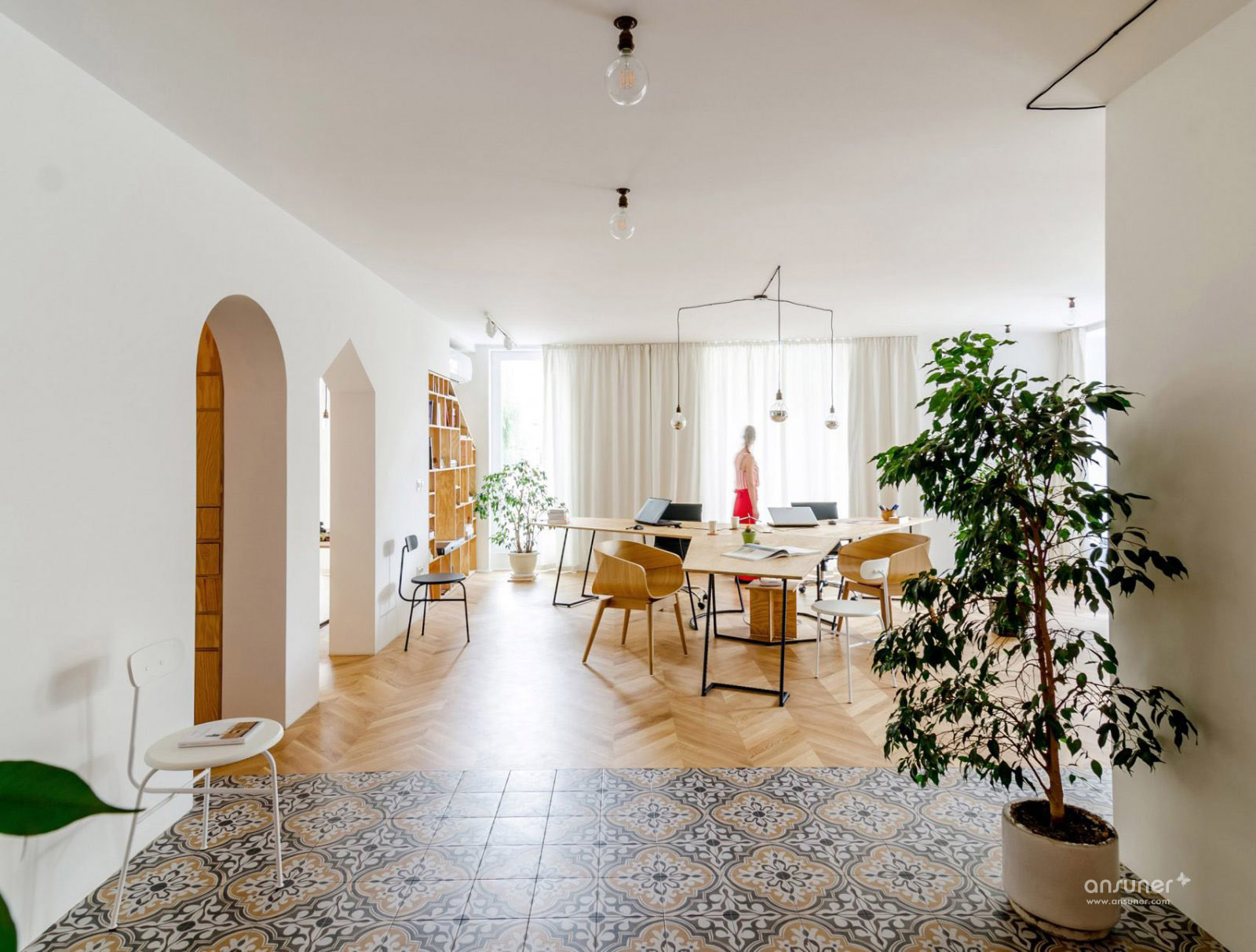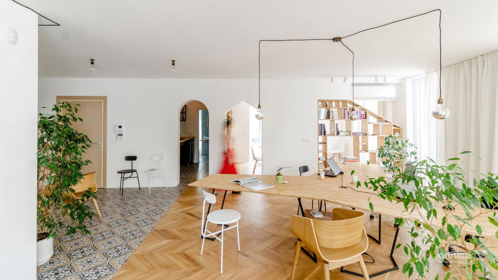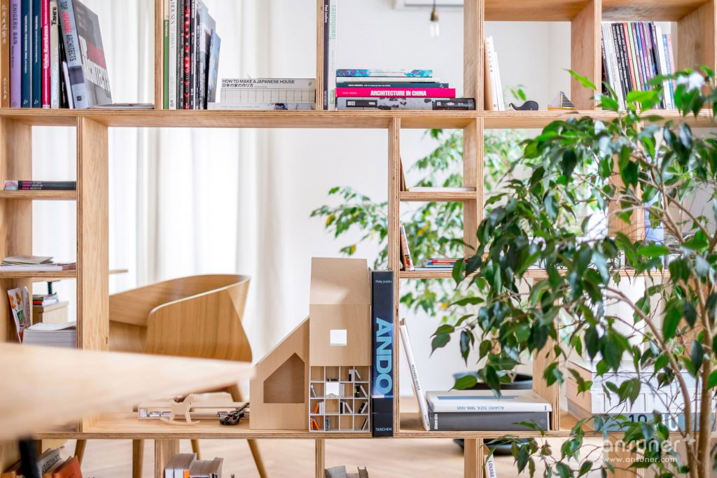 工作室包括两个主要工作区域,一个物理建模空间,一个会议室,一个厨房,一个浴室和两个露台。胶合板书架双重作为家具,使房间尽可能节省空间。在会议室和建筑空间之间,书柜可根据需要设置可拆卸元件,形成座位和侧桌,分离厨房和工作室空间的单元有一个内置的衣架。地板区分了房间,从各种布置的橡木地板到装饰瓷砖。 这些瓷砖意图类似于分散在太空中的地毯,营造出温馨的氛围。