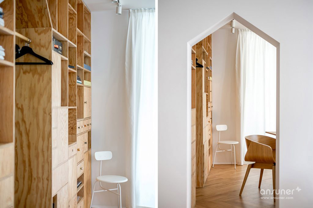 为了实现这一点,他们拆除了前公寓的所有承重墙,将其改造成一个开放式的工作室。然后他们使用胶合板建造新的隔板,整合了货架,立方木,抽屉和橱柜。由于这些特征开口,它们确保不同的区域在视觉上相连。建筑师还添加了半透明的白色棉花窗帘,以便在必要时可以进一步分隔空间。