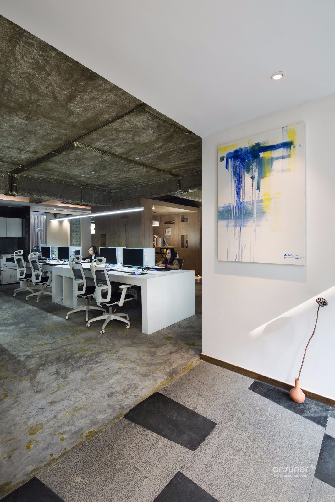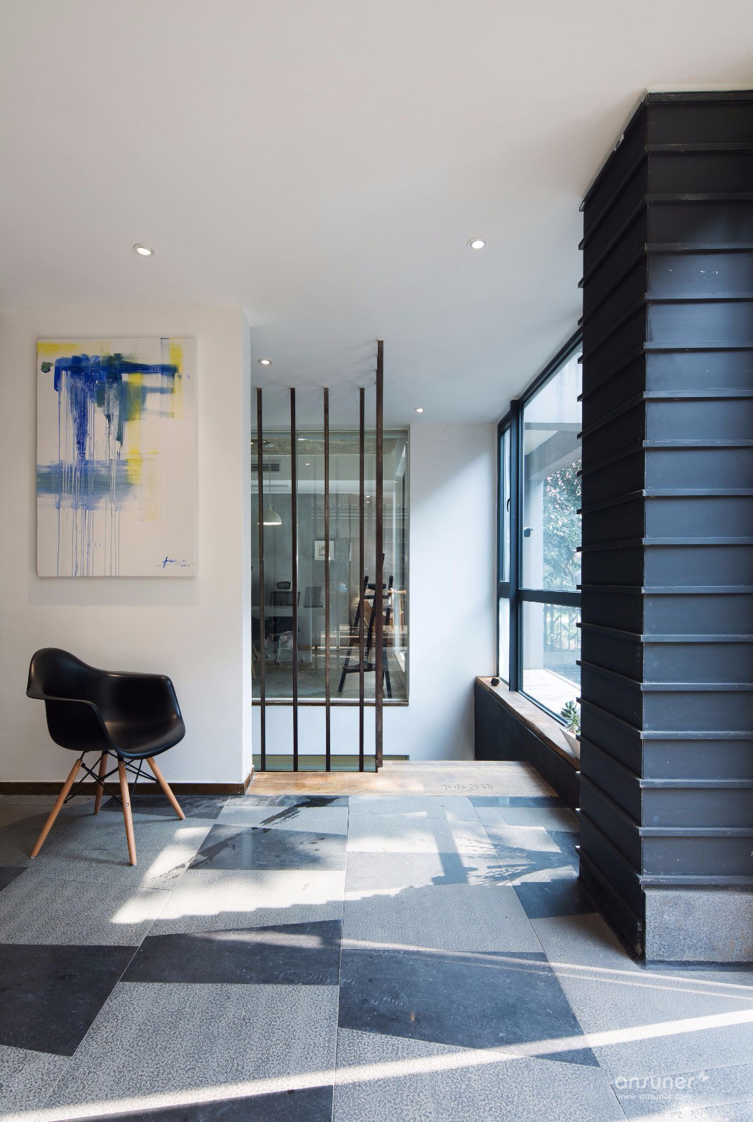 办公空间一共分为上下两层,上层是日常的办公空间,所有墙面的色泽深浅变化与印压痕迹,打造出新旧交融的后现代风格空间,独具粗犷的美感,。办公桌椅及办公用具皆采用白色,与空间色调搭配既和谐又现代。场地对角线处隔出一个玻璃空间和木框空间,采用半隔断的方式使空间的划分自由度很高,平常可用于简单的会议和会客,通透的玻璃天花板让采光变的更通透,再配以随时开合的玄色卷帘,显得极为体贴温馨。