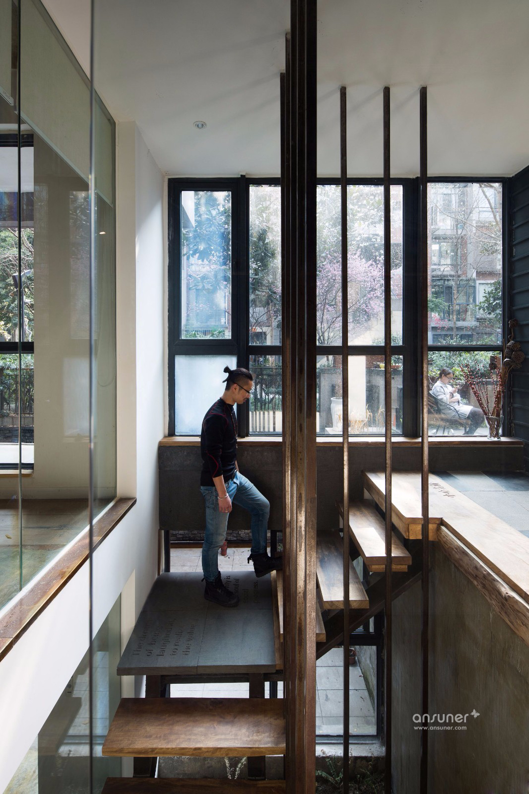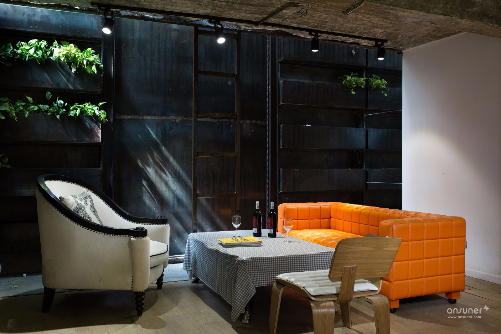 下层是半封闭的庭院空间,从上下互通的围栏到楼梯,皆用裸露的钢结构组成,所有的铁块、钢管都是事先经过太阳暴晒形成锈迹,再加以应用。楼层间是一整面墙,铁质槽口处,种了些许植物,中间的空白处,镂刻出“TCD”三个字母。看似简单干净的旧式厂房里,却涌动着一股清新的气息。下层的空间可以说就是一个家的样子,几张长沙发随意摆放,惬意的茶水区,可供娱乐和休息。困顿倦怠的时候随时可从1楼办公区移步到下层小憩养神。