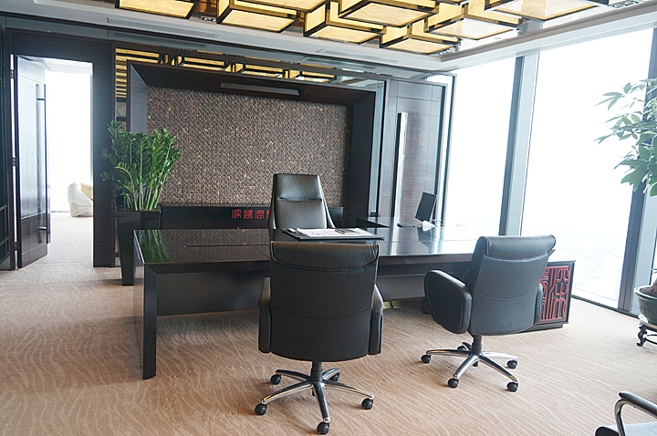 wood and the combination of high-tech, using touch intelligent drawing cabinets, hide desktop type stationery box and walk the line, the springback mute damping sliding rail, electronic smart lock, multifunctional pleasant office equipment, HD ultrathin conference display screen, electric seat. Maximize the embodiment of Chinese intelligent, humanization. Electronic control, automatic lifting