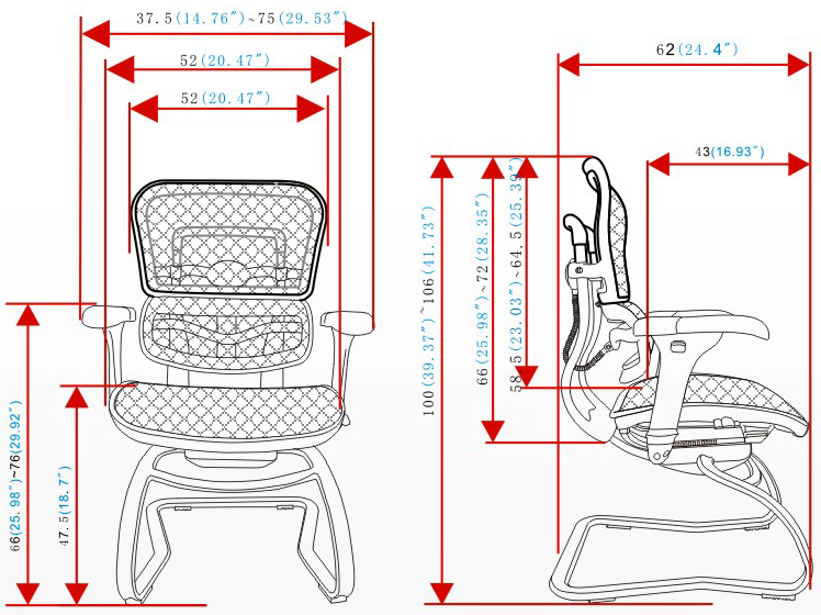 头枕、背垫、腰枕及座垫均为进口网布;黑色塑胶框架,PU扶手垫;塑胶头枕插条、头枕横把手;背支撑架、底盘支撑架均为铝合金精抛光;100MM气压棒,340MM铝合金精抛光椅脚,60MM PU滑轮;